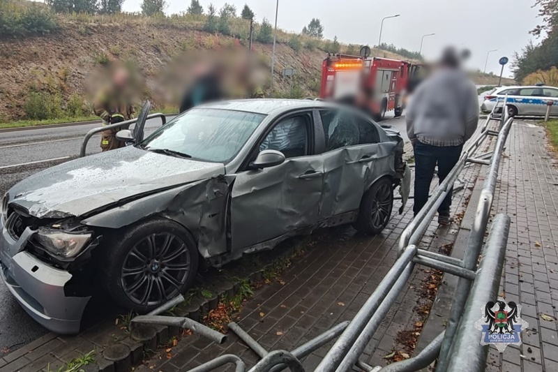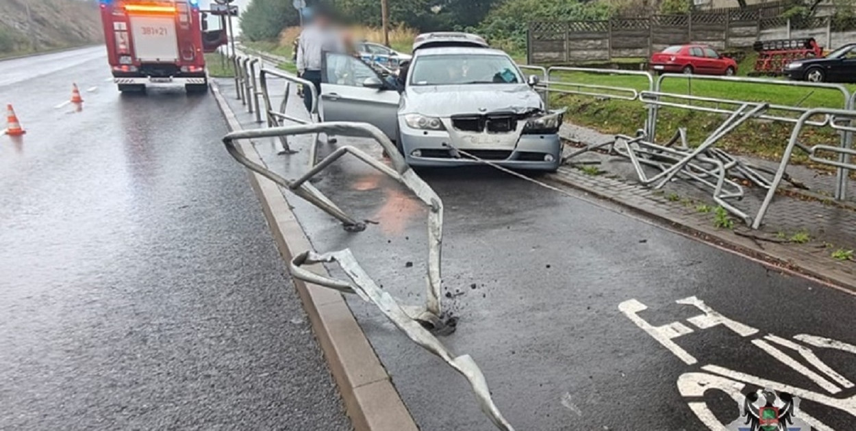 Było ślisko po deszczu. 46-latek kierujący samochodem osobowym, jadąc ul. Kamieniecką w kierunku Jedliny-Zdroju, w wyniku niedostosowania prędkości do panujących warunków, stracił panowanie nad autem i uderzył w barierki.