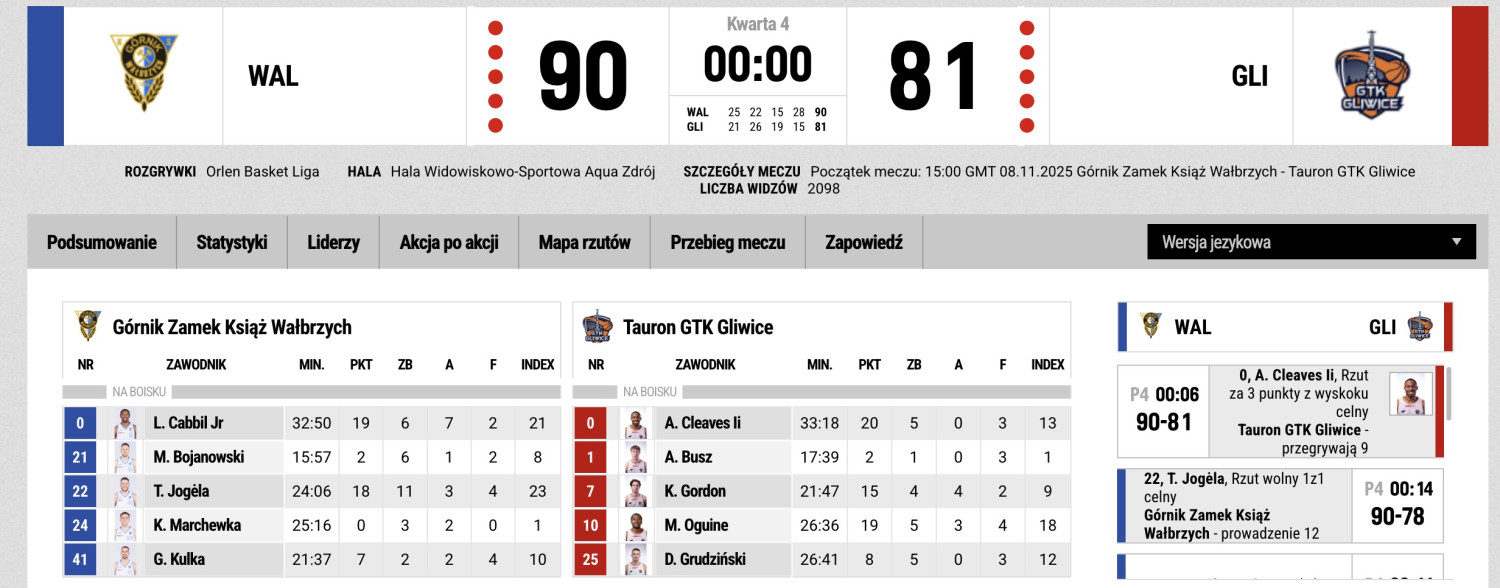 Górnik Wałbrzych podjął dziś na swoim parkiecie GTK Gliwice mecz zakończył się wynikiem 90:81