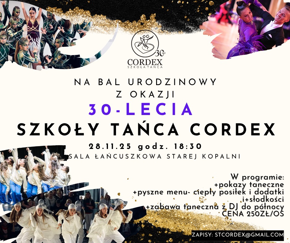 Wałbrzyska Szkoła Tańca Cordex świętuje Jubileusz 30-lecia istnienia. Szkoła jest miejscem kształcenia kolejnych pokoleń młodych tancerzy, spełnienia ich marzeń, osiągania sukcesów i zdobywania czołowych miejsca na turniejach ogólnopolskich i międzynarodowych
