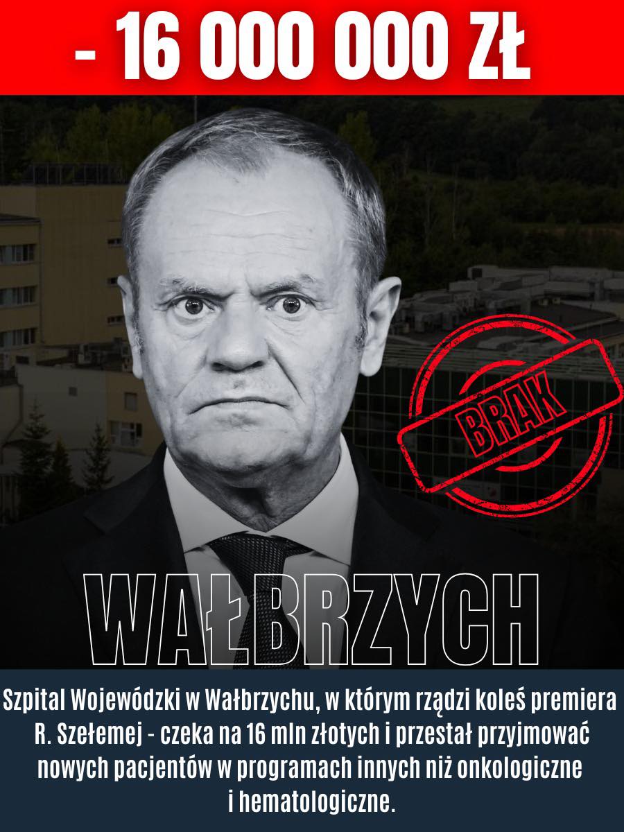 Wokół Specjalistycznego Szpitala im. dra Alfreda Sokołowskiego w Wałbrzychu wybuchł spór na linii polityk–placówka medyczna. Były minister cyfryzacji i poseł PiS Janusz Cieszyński opublikował w mediach społecznościowych wpis, w którym sugeruje, że szpital podległy marszałkowi Dolnego Śląska i wiązany z prezydentem Wałbrzycha Romanem Szełemejem – a więc z władzami samorządowymi powiązanymi z premierem Donaldem Tuskiem – wstrzymał przyjęcia nowych pacjentów w części programów medycznych. Dyrekcja odpowiada stanowczo: „To kłamstwo”.