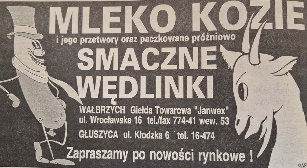 Jeśli ktoś ma wątpliwości, że świat zmienił się o 180 stopni, niech otworzy stare numery Tygodnika Wałbrzyskiego. Reklamy z 1995 roku wyglądają dziś jak pocztówki z epoki analogowego chaosu: czarno-białe łamy, toporne czcionki i grafiki, które bardziej przypominają szkolne rysunki niż profesjonalne projekty. A jednak — w tej surowości było coś prawdziwego. Zero udawania, zero filtrów. Zwykła informacja podana wprost: „Mamy mleko kozie. Mamy wędliny. Chodź i kup.”