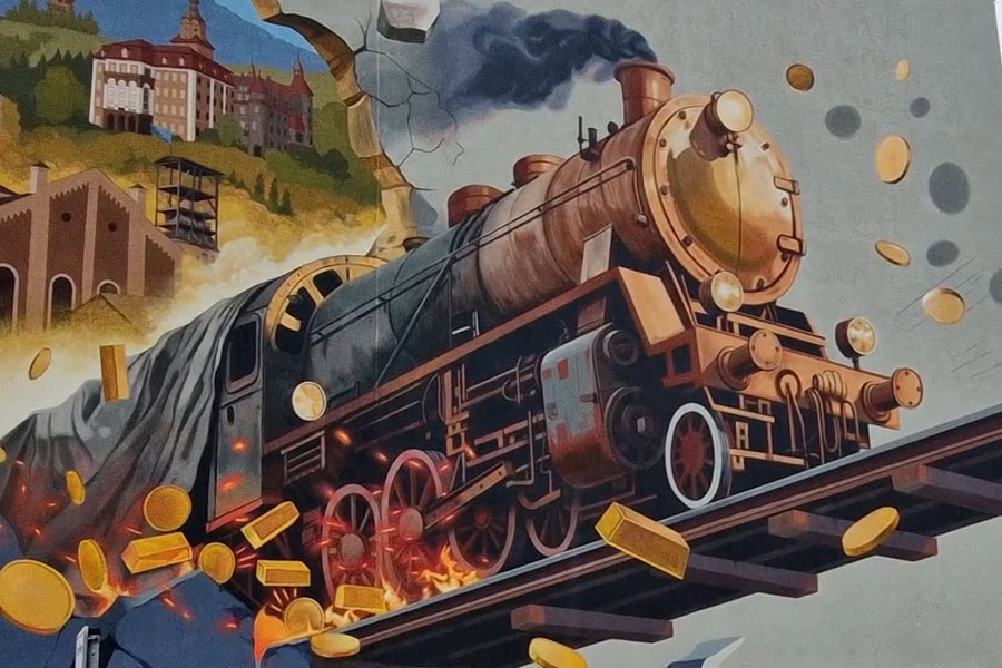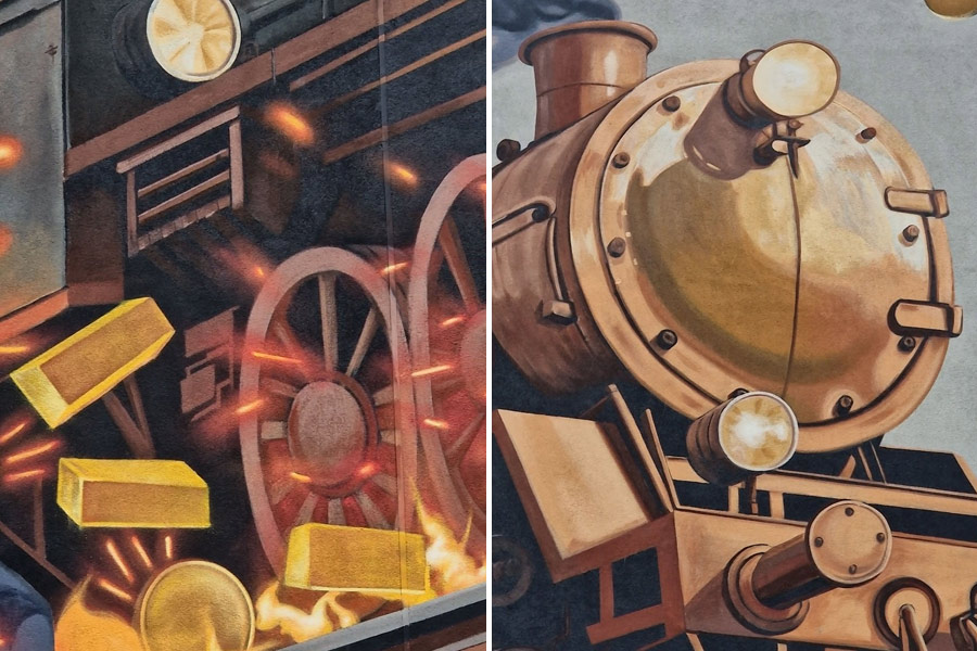 Projekt stworzył znany wałbrzyski artysta Tomasz Maroński, a za wykonanie odpowiedzialni byli Kamil Tobiasz i Karol Chada. Mural przestawia legendarny złoty pociąg, który z impetem przebija ścianę budynku. W tle widzimy ikoniczne zabytki Wałbrzycha - Zamek Książ i Starą Kopalnię.