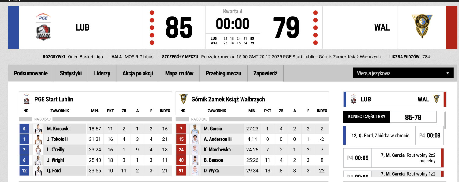 Koszykarze Górnika Zamek Książ Wałbrzych przegrali wyjazdowe spotkanie z PGE Start Lublin. Mecz zakończył się wynikiem 85:79