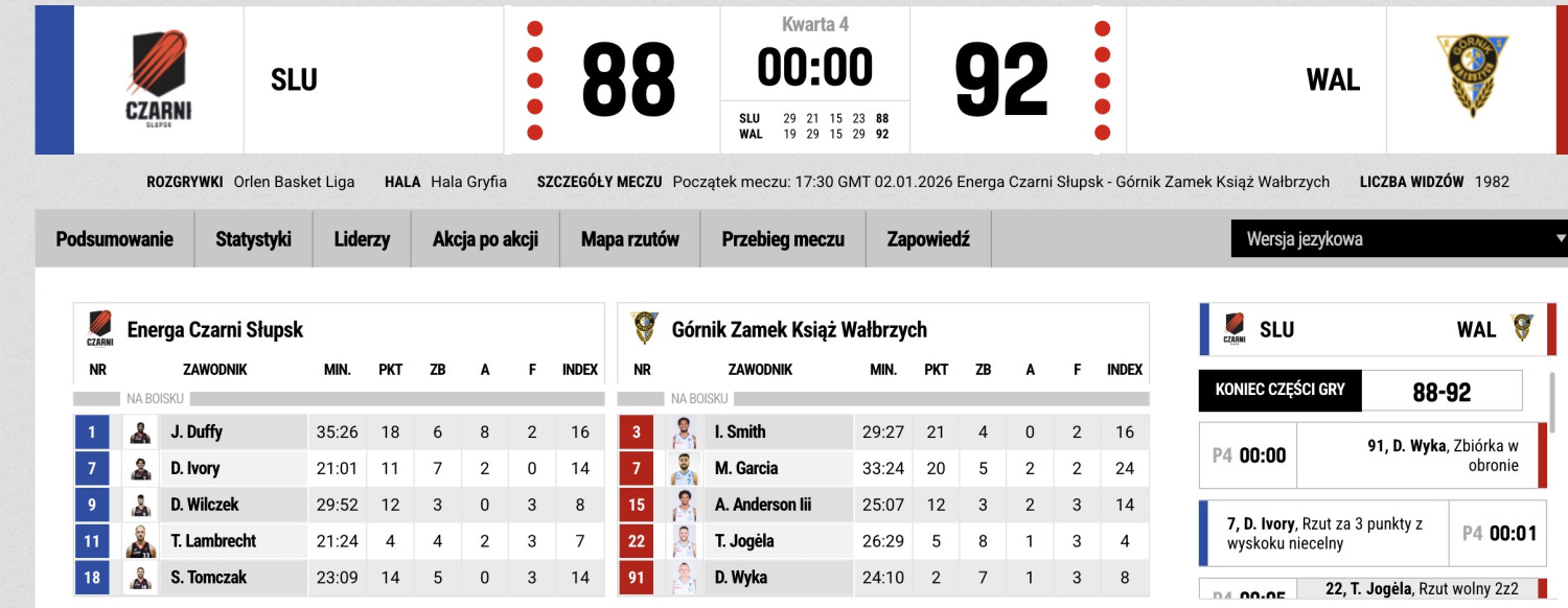 Wyjazdowe spotkanie Górnika Zamek Książ Wałbrzych z Czarnymi Słupsk zakończyło się wynikiem 92:88