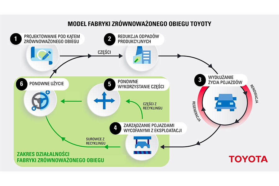 Toyota Motor Europe zapowiedziała otwarcie Fabryki Zrównoważonego Obiegu, która ma powstać w ramach funkcjonującej w Wałbrzychu fabryki Toyota Motor Manufacturing Poland. Zakład będzie zajmował się odzyskiwaniem użytecznych części z wycofanych z eksploatacji pojazdów.