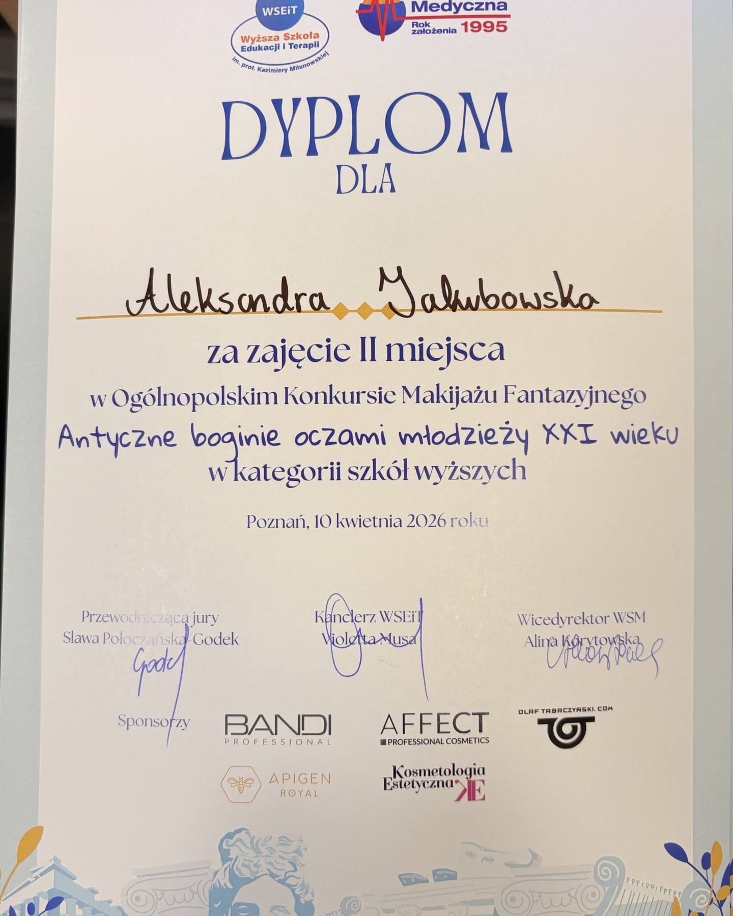 Mamy powód do dumy! Wielki sukces naszej studentki na arenie ogólnopolskiej. informuje Akademia Nauk Stosowanych Angelusa Silesiusa. Aleksandra Jakubowska, studentka I roku kosmetologii, zajęła II miejsce w ogólnopolskim konkursie makijażu fantazyjnego pt. „Antyczne boginie oczami młodzieży XXI wieku”.