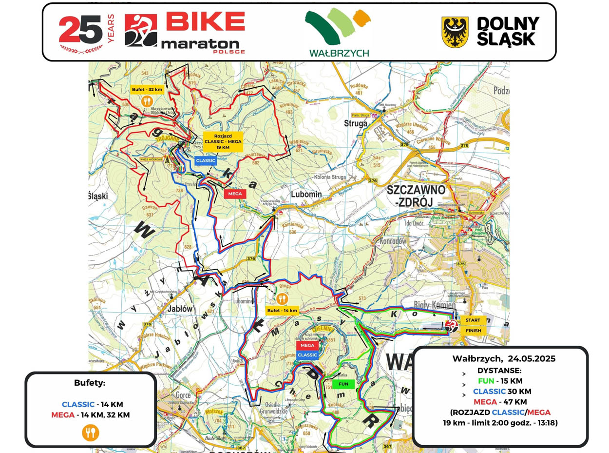 Nowością tegorocznej edycji jest kategoria e-bike, gdzie zawodnicy na elektrykach będą rywalizować w klasyfikacji open. Impreza startuje o 24 maja o godzinie 10:00. Zapisy odbywają się na stronie internetowej datasport.pl. Więcej szczegółów o wydarzeniu znajdziecie na stronie bikemaraton.com.pl. Impreza w Wałbrzychu będzie trzecim przystankiem Bike Maratonu na Dolnym Śląsku. Dotychczas rozegrano już zawody w Szklarskiej Porębie i Miękini. Łącznie w cyklu zaplanowano 10 edycji z finałem w Świeradowie-Zdroju 11 października.