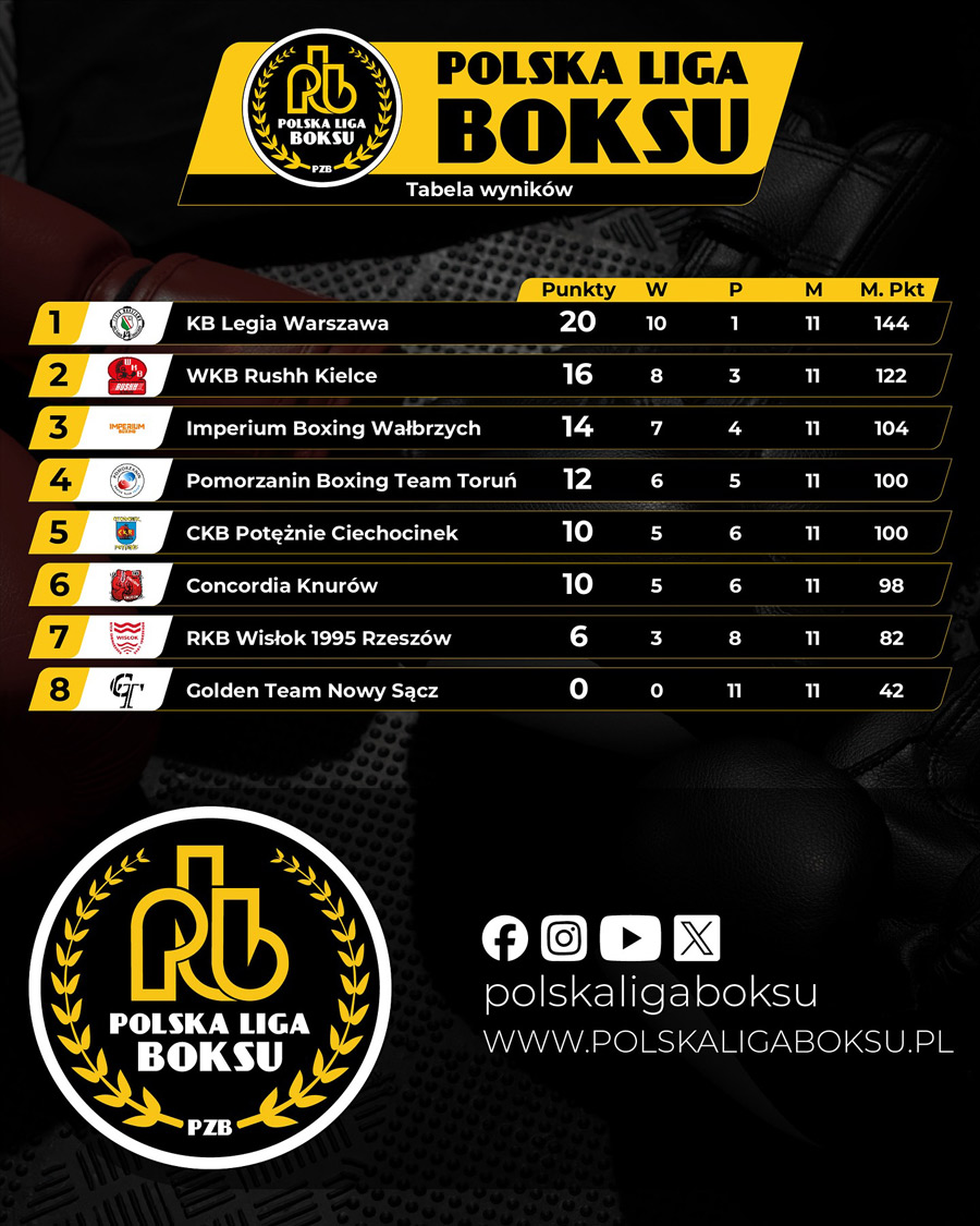 Naszym najbliższym przeciwnikiem będzie WKB Rushh Kielce - drużyna, która wyprzedza nas w tabeli o jedną pozycję z przewagą zaledwie dwóch punków. W tym meczu, który odbędzie się w najbliższą niedzielę (9.11) w Hali Wałbrzyskich Mistrzów o godzinie 11:00 stawką jest drugie miejsce w tabeli, a liczyć się będzie każde pojedyncze starcie, bo w przypadku wygranej całego meczu przez Wałbrzyszan o pozycji decydować będą "małe punkty". Będzie to jednak trudna przeprawa, ponieważ w poprzednim starciu wyraźnie dominowała ekipa z Kielc wygrywając mecz 14:4. Przegrana Imperium może oznaczać spadek na 4. pozycję, ponieważ po piętach depcze nam Pomorzanin Boxing Team Toruń, który w tej kolejce zmierzy się ze słabo dysponowanym w tym sezonie RKB Wisłok 1995 Rzeszów, który wygrał jedynie 3 z 11 dotychczasowych spotkań i zajmuje przedostatnie miejsce w tabeli. Pomorzanin może zatem zrównać się z Imperium w stawce, a o pozycji decydować będą "małe punkty". Zatem emocje w najbliższą niedzielę w Hali Wałbrzyskich Mistrzów gwarantowane!