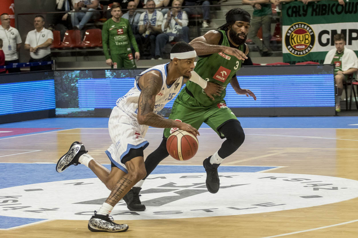 Pierwsze minuty spotkania upłynęły pod znakiem problemów obu zespołów w ofensywie. Akcje często kończyły się niecelnymi rzutami, a wynik długo oscylował wokół remisu. Krośnianie potrafili jednak na moment przejąć inicjatywę – trafienia z dystansu Tre Jacksona i Michała Jankowskiego dały im prowadzenie.
