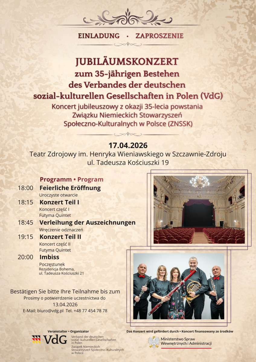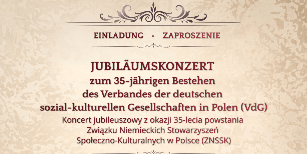 Zapraszamy na uroczysty koncert jubileuszowy z okazji 35-lecia powstania Związku Niemieckich Stowarzyszeń Społeczno-Kulturalnych w Polsce (ZNSSK).