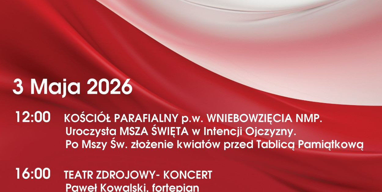 Burmistrz Szczawna - Zdroju, Radni Rady Miejskiej w Szczawnie – Zdroju oraz Dyrektor Teatru Zdrojowego zapraszają na obchody Święta Narodowego Trzeciego Maja.
