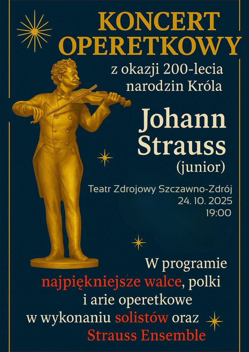 Zapraszamy na wyjątkowy koncert operetkowy poświęcony twórczości genialnego Johanna Straussa (syna) – kompozytora, który zamienił Wiedeń w taneczną stolicę świata, a każdą melodię w opowieść o radości życia, miłości i urokach przemijającego czasu.
