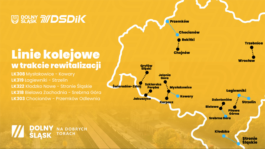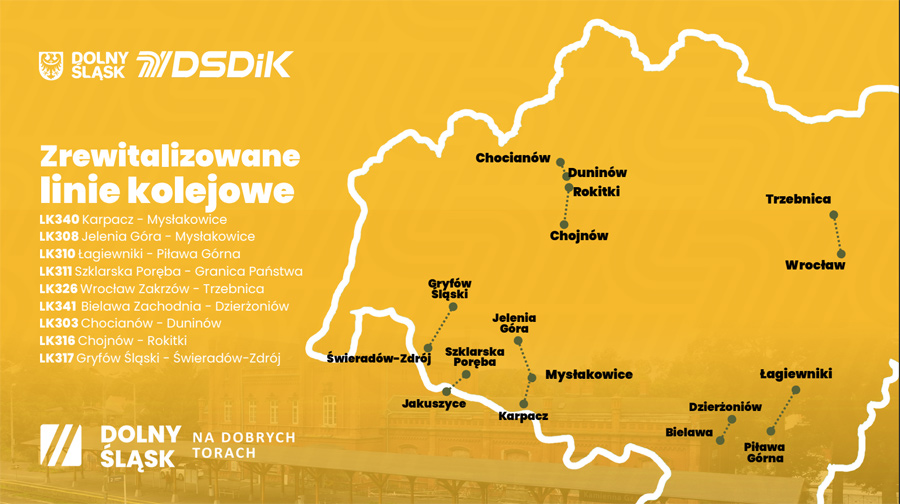 Wśród planowanych przedsięwzięć znajdują się m.in. linie kolejowe nr 308 i 345, które połączą Kamienną Górę i Kowary z Jelenią Górą, a także linia nr 284 na odcinku Lwówek Śląski – Jerzmanice-Zdrój. Samorząd liczy również na szybkie rozstrzygnięcie postępowań przetargowych dotyczących drugiego etapu rewitalizacji linii nr 310 na trasie Kobierzyce – Łagiewniki, co umożliwi niezwłoczne podpisanie umowy z wykonawcą.