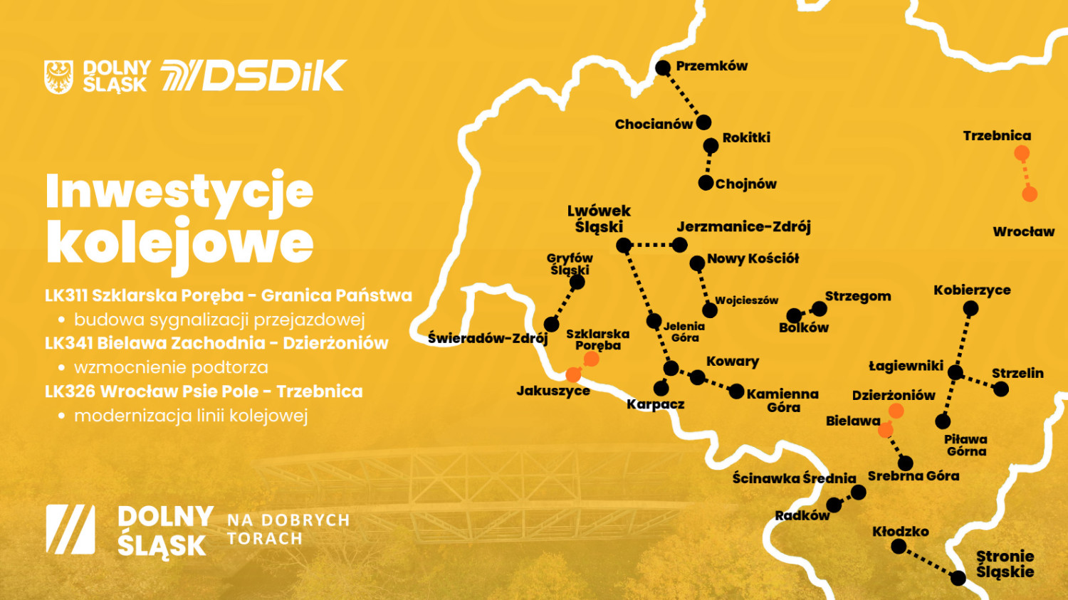 Obecnie Dolnośląska Służba Dróg i Kolei prowadzi prace rewitalizacyjne na pięciu liniach kolejowych jednocześnie. Część z nich, jak linia nr 318 w kierunku Srebrnej Góry, stanowi naturalne przedłużenie szlaków, których modernizację zakończono w poprzednich latach. Równolegle na różnych etapach przygotowania inwestycyjnego znajduje się osiem kolejnych linii, z których część jeszcze w tym roku ma wejść w fazę realizacji.