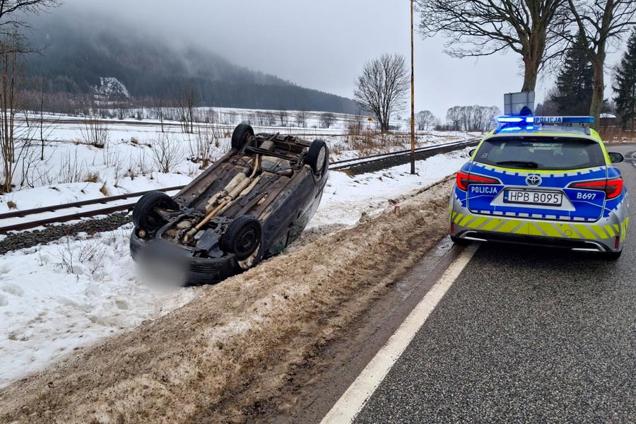 Dzisiaj (czwartek, 15.01) przed godziną 11:00 około 300 metrów od granicy z Czechami w Lubawce, doszło do groźnie wyglądającego zdarzenia drogowego. Policjanci Wydziału Ruchu Drogowego Komendy Powiatowej Policji w Kamiennej Górze ustalili, że 71-letni kierujący z powiatu wałbrzyskiego nie dostosował prędkości do warunków panujących na drodze, w wyniku czego na łuku drogi zjechał z jezdni i dachował. Mężczyzna jechał sam, nic poważnego mu się nie stało.
