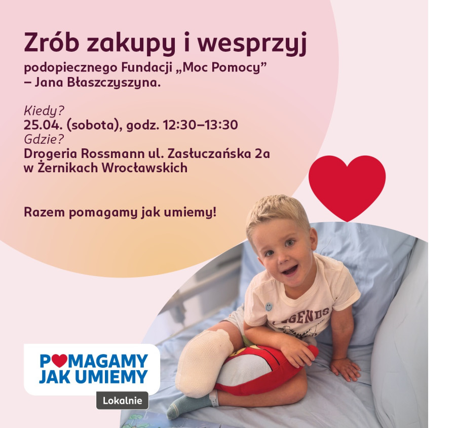 25 kwietnia w drogerii Rossmann w Żernikach Wrocławskich na godzinę kasy przejmą przedstawiciele Fundacji „Moc Pomocy”. Całkowity dochód ze zrobionych w tym czasie zakupów wesprze rehabilitację podopiecznego fundacji – Janka Błaszczyszyna.