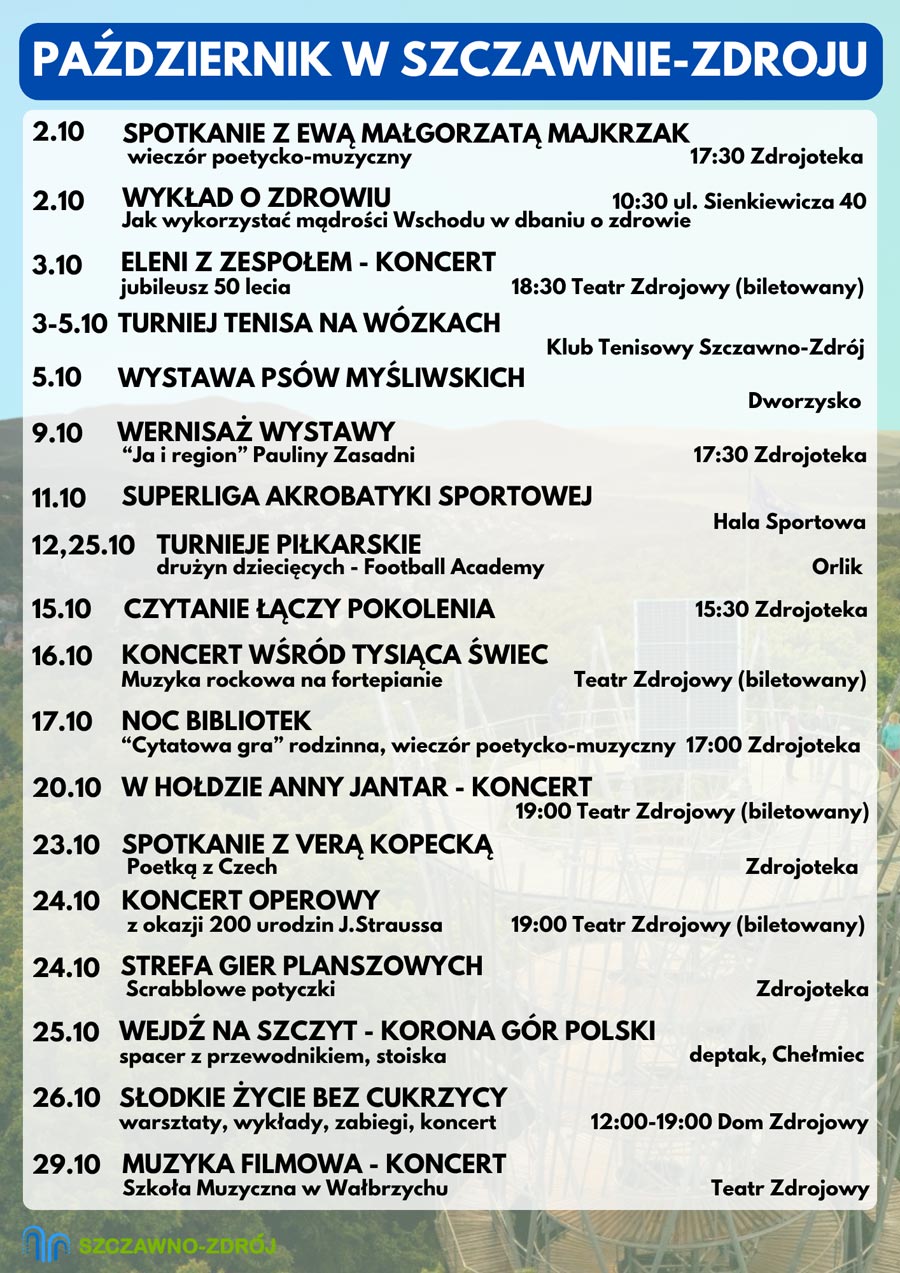 Jesień w uzdrowisku nie musi być nudna. W Szczawnie-Zdroju w październiku będzie wiele atrakcji zarówno dla miłośników aktywności na świeżym powietrzu, jak i dla tych, co wolą spędzać chłodniejsze dni pod dachem.