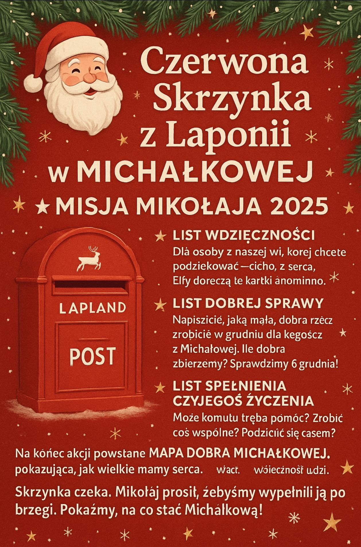 Akcja trwa od dziś do 6 grudnia. Czerwona skrzynka przy ul. Młyńskiej czeka na Wasze listy. Michałkowa pokazuje, że magia Świąt zaczyna się od zwykłej, ludzkiej życzliwości.