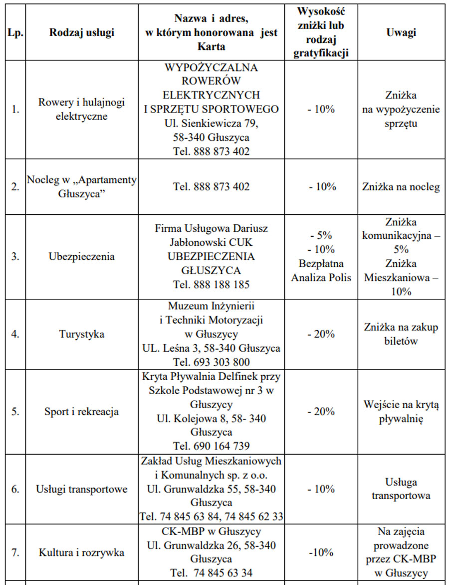 Program dopiero się rozpędza, ale pierwsze karty już działają. Lista zniżek – która systematycznie się powiększa – pokazuje, że bycie „u siebie” w Głuszycy może się po prostu opłacać. Regulamin przyznania karty, wniosek o jej wydanie i listę aktualnych benefitów znajdziecie na stronie Urzędu Miejskiego w Głuszycy.